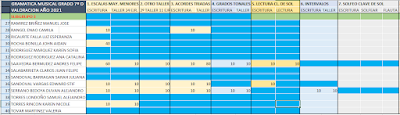 A continuación, encontraran los cuadros de los subgrupos 1, 2, 3 con las calificaciones que han obtenido hasta el momento en la asignatura Gramática Musical. Las casillas coloreadas serán las actividades que deben presentar en la siguiente clase presencial.